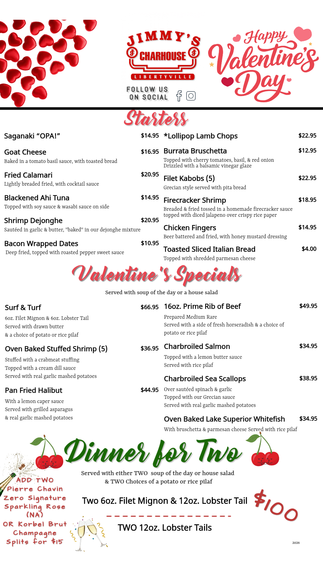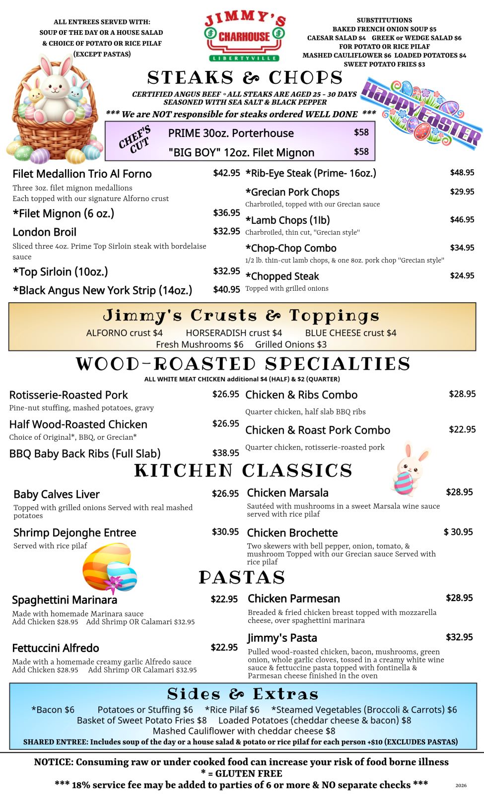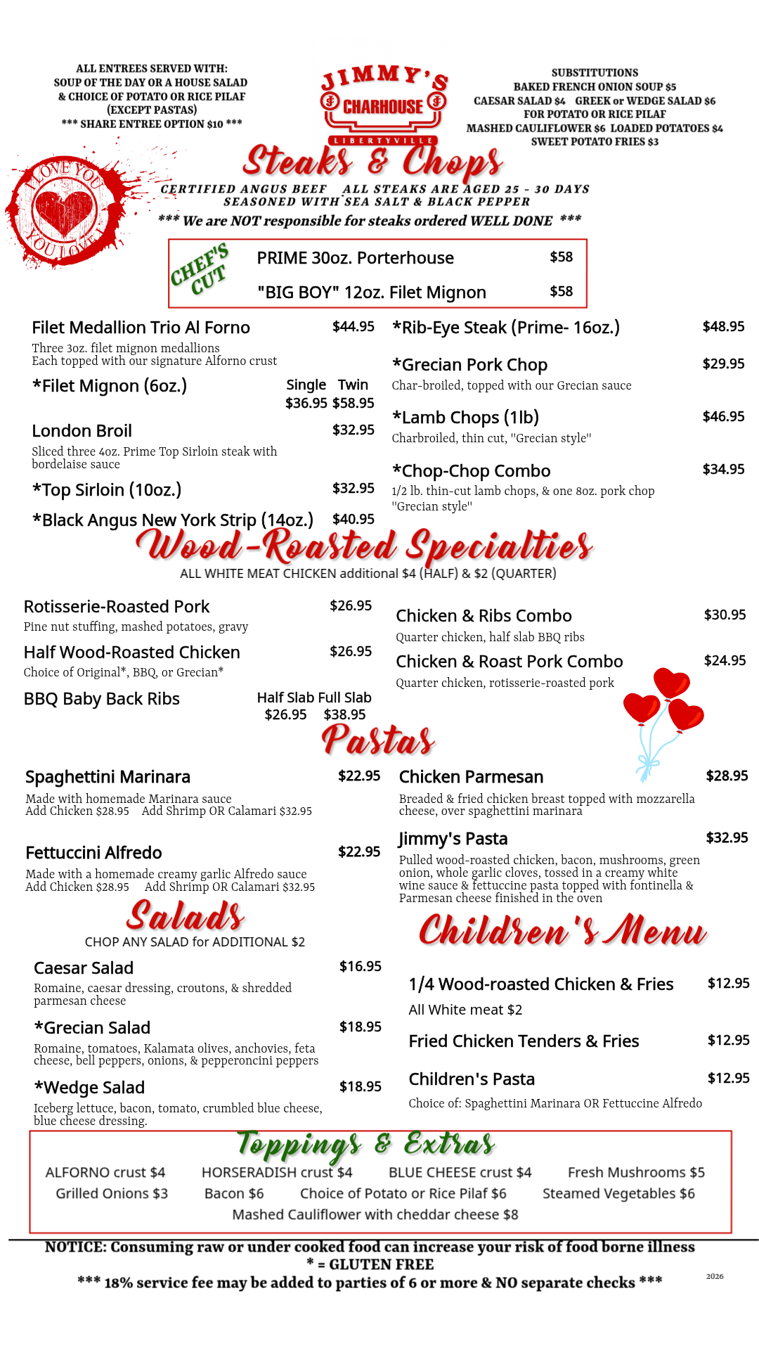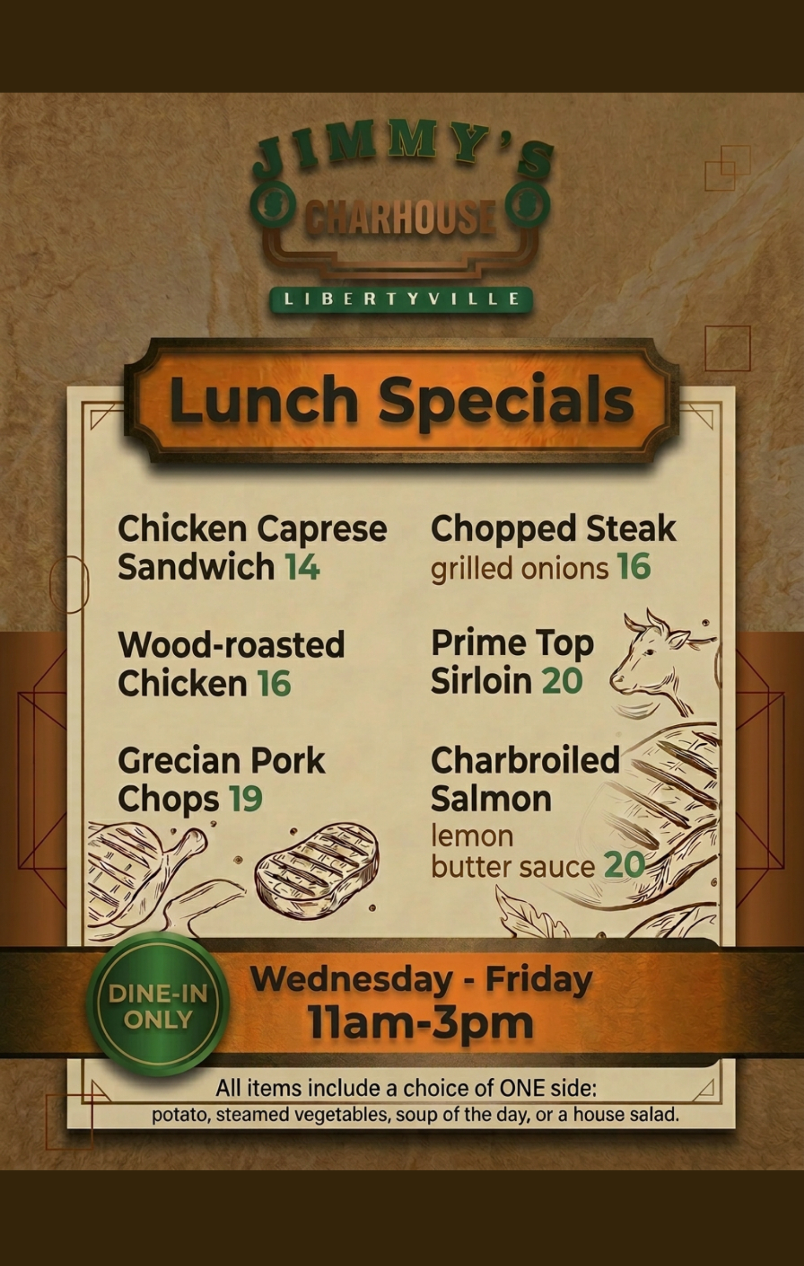 Here at Jimmy’s Charhouse, we want to provide our guests with quality food and service that will exceed what you wouldn’t expect anywhere else, but here. We use only the freshest fish & seafood available. All of our steaks and chops are custom cut, by us, to ensure quality. Chicken and ribs are slow roasted in our wood-burning rotisserie ovens. The burgers are USDA steak, hand-packed here in our kitchen. Soups are made daily from only the finest ingredients and we make all of our own salad dressings and BBQ sauce for great flavor. If you have a sweet tooth, we make amazing desserts, as well.